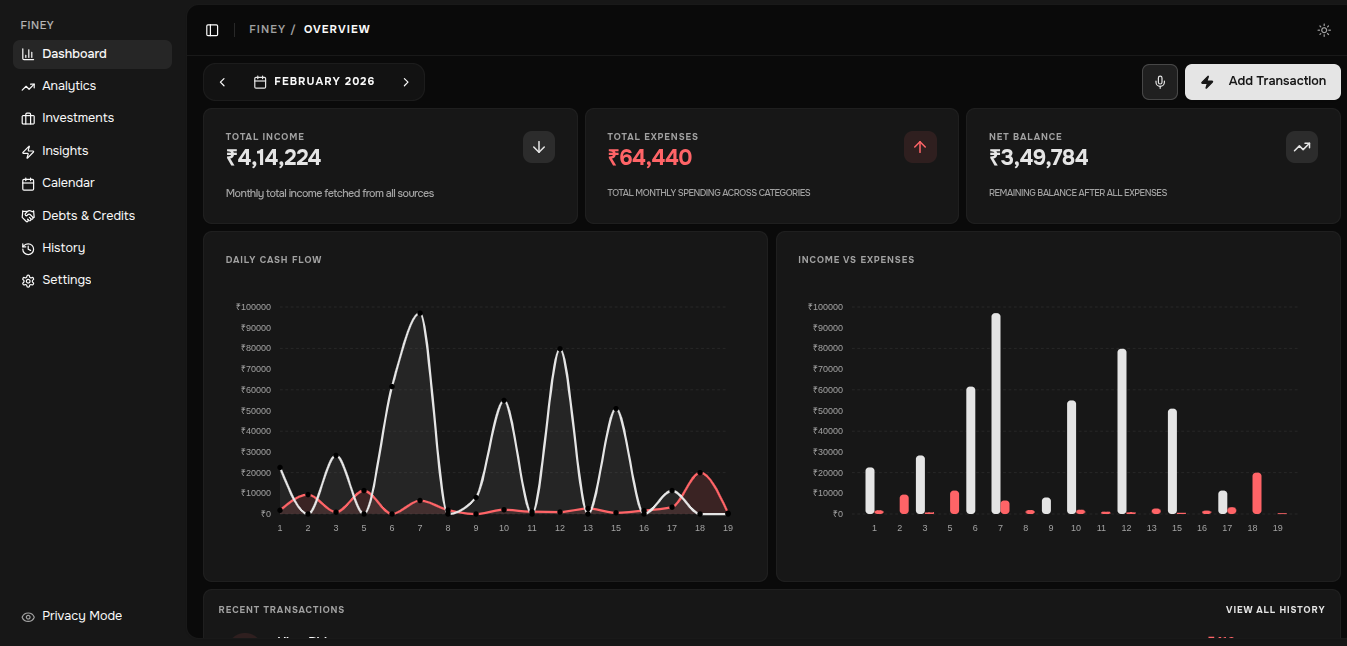 Finey is a privacy-first expense tracker app that prioritizes on-device data storage. Core features include AI-powered input, custom categories, smart spending analytics, transaction history.