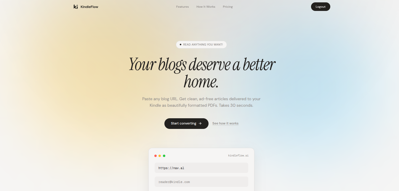 AI tool that converts blog articles into clean, Kindle-optimized PDFs and delivers them directly to your Kindle email in under 30 seconds, with free and paid tiers up to unlimited usage